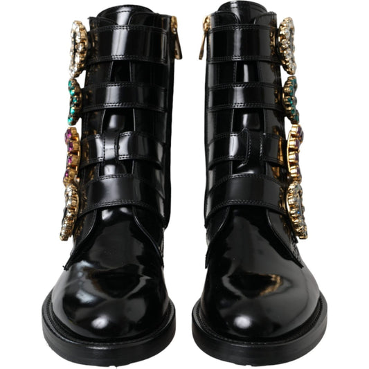 حذاء بوت من الجلد الأسود مع أبازيم كريستال من دولتشي آند غابانا